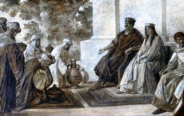 Gabriel arrête le bras d’Abraham prêt à sacrifier son fils que la tradition islamique apparente à Ismaël.