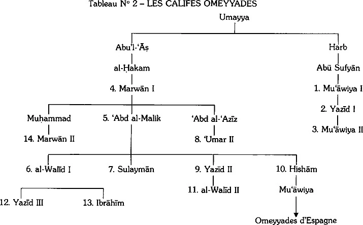 - Marwan ibn al-Hakam ibn Abu al-'As ibn Umayyah (623-685) est le quatrième calife omeyyade. Avec sa cousine, Aisha bint Mwauyia ibn Al-Mughira[6], ils sont les parents entre autres de :