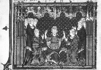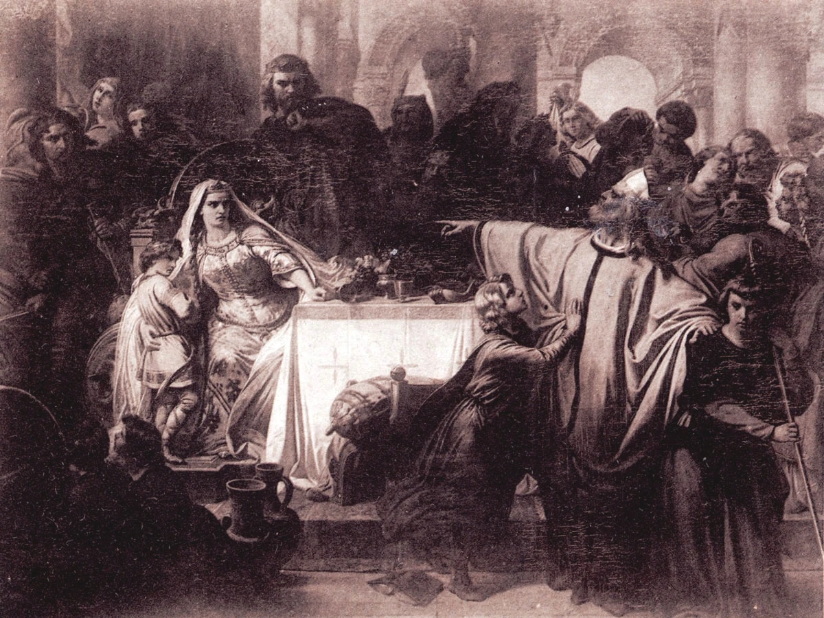 Le Banquet de Jupille. Au centre, l’évêque Lambert, désigne du doigt Alpaïs. Assise à gauche, dominée par Pépin, la soi-disant concubine protège sous son bras droit le jeune Charles Martel.