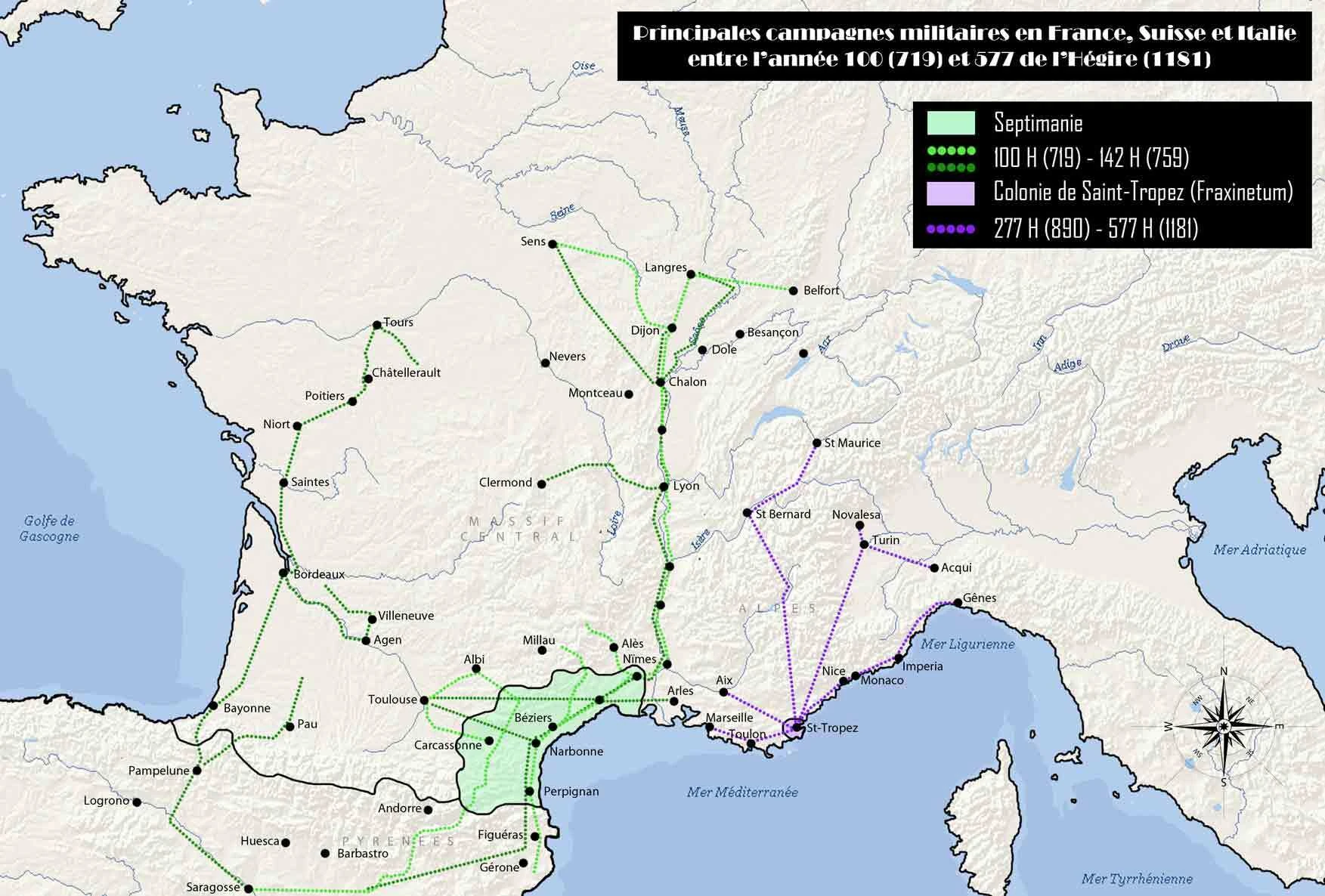 - ↑ Senac Philippe, Musulmans et Sarrasins dans le sud de la Gaule du VIIIe au XIe siècle, Le sycomore 1980.