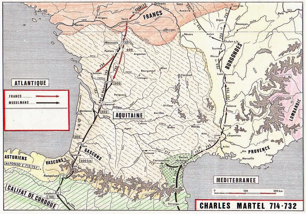 La conquête par les musulmans de la Francie c'est pour les chrétiens du sud et du centre la fin d'un monde (717-731). Un musulman devient son allié et son gendre, alors que Charles Martel redevient un ennemi (731-732). En 732, le wali Abd ar-Rahman envahit le sud-ouest. C'est la Bataille de Bordeaux (732). Après cette défaite qui permet aux Arabes de dévaster et piller le sud-ouest de la Francie, la Bataille de Poitiers (732) interrompt leur expansion, vers le nord de l’Europe occidentale. C'est un événement considérable, comme le souligne la Britannica Online Encyclopedia.