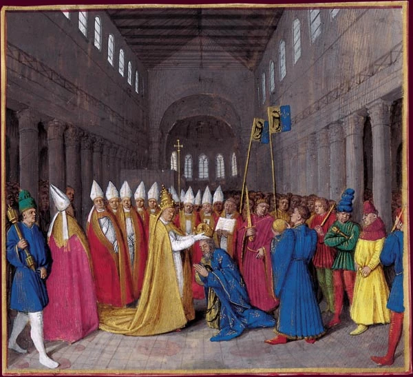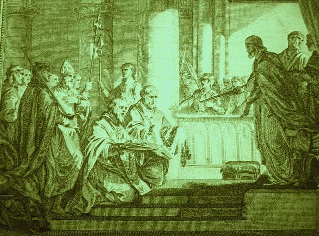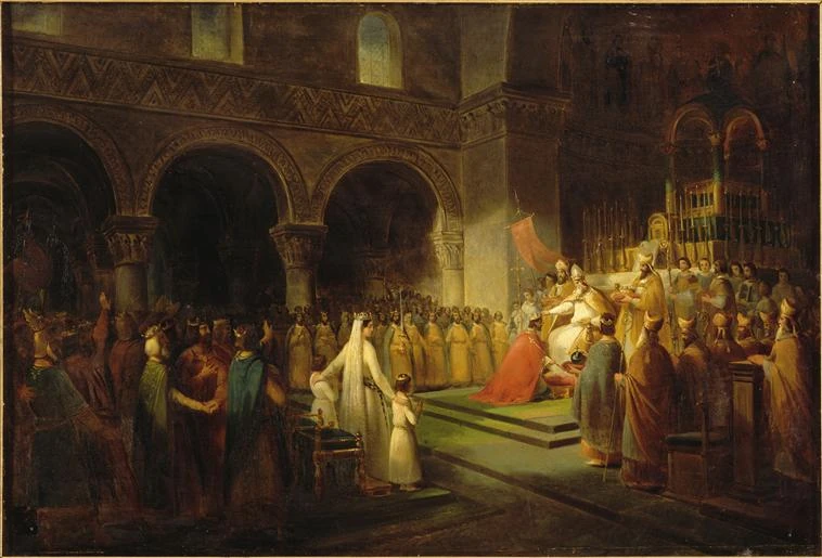 Sacre de Pépin le Bref par le pape Etienne II à Saint-Denis, le 28 juillet 754.