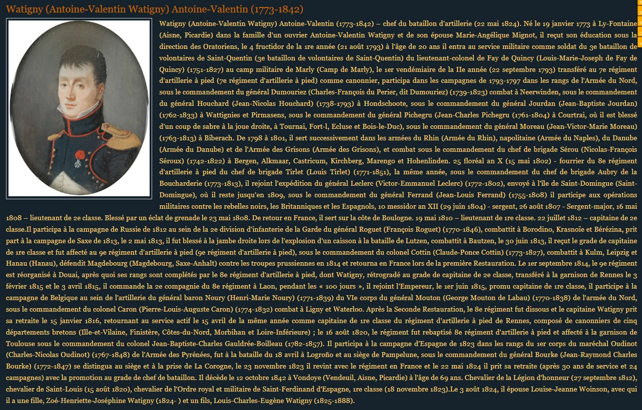 Article d'universitaires russes sur le colonel Watigny, dont j'ai hérité des Mémoires, qui a combattu en Russie. Un livre en deux volumes publié en 2012, par la mairie de Moscou, sur l'occupation française de la ville parle de lui et illustre le chapitre avec son portrait.