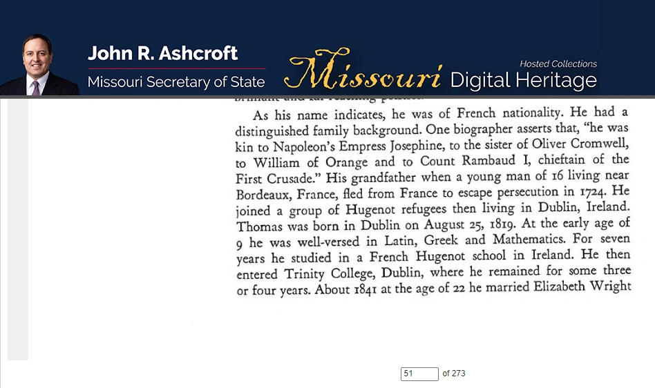 Les origines des Rambaud/t sont illustres remarque John Robert "Jay" Ashcroft, secrétaire d'État du Missouri.
